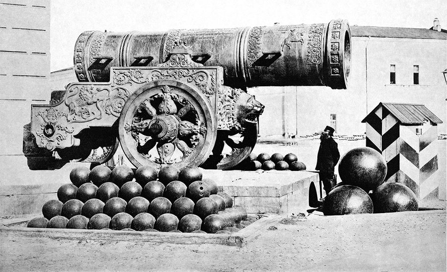 К Арсеналу 40-тонного гиганта перевезли в 1820 г. Это было связано с решением императора Александра I устроить в Кремле Плац-парад: площадь для торжественных смотров. К 1831 г. были сделаны постаменты для достопамятных орудий XVI–XVII вв., а через 4 года на чугунолитейном заводе Чарльза Берда отлили декоративный лафет и чугунные ядра калибром 120 пудов для Царь-пушки. Автором чертежей лафета был генерал П.Я. де Витте, а орнамент в «русском стиле» сделан по эскизам академика А.П. Брюллова. С тех пор возле Царь-пушки красуется табличка «Дробовик российский, лит 1586 г., вес ядра 120 пуд», которая до сих пор сбивает с толку посетителей…