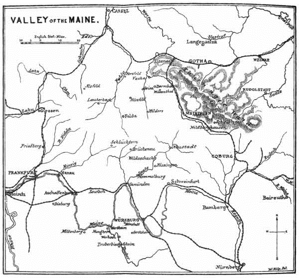 Having been informed that the Hanoverians were marching on Fulda, Prince Charles began a forward movement, to effect a junction with them at that point; but receiving later news to the effect that the occupation of Hesse-Cassel had caused the Hanoverians to turn off towards Mühlhausen, and that Prussian forces were concentrating at Eisenach, he decided to direct his march more to the right, so as to be able to operate either by way of Fulda or the Thuringian Forest [Thüringer Wald], as circumstances might decide. The march of the Bavarians was begun on June 22d; but much was wanting to complete their organization and equipment, and their progress was so slow that on the 26th their most advanced division had only reached Neustadt, on the Saale, scarcely twenty miles from Schweinfurt.