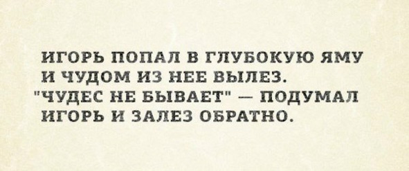 На эту тему мы сами придумываем о себе горьковатые притчи. Вроде такой вот: Игорь попал в глубокую яму и чудом из нее вылез. «Чудес не бывает» – здраво рассудил Игорь и… залез обратно. (Как говорится, было бы смешно, не будь оно так печально.)