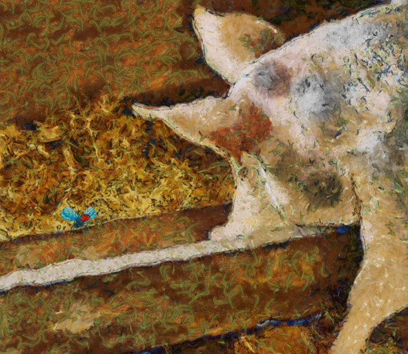 Позади странного существа лежала пара благоухающих кучек навоза. Маленький Мух снизился по спирали и сел прямо в середину самого свежего, теплого еще куска. В предвкушении потер лапки, как это делают все мухи.