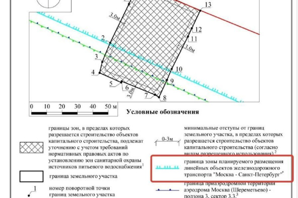 На чертеже ГПЗУ видно пятно застройки по всему периметру земельного участка с учётом отступов в 3 метра. В данном случае, в отличие от предыдущего, у нас пятно застройки по всему периметру. Однако есть обременение в виде границы зоны планируемого размещения линейных объектов железнодорожного транспорта Москва – Санкт-Петербург. Как раз вот на эту сделку я был привлечён в качестве эксперта перед покупкой земельного участка.