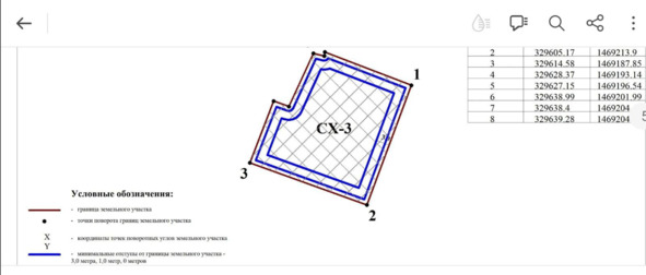 Данный земельный участок, согласно сведениям ГПЗУ, расположен в территориальной зоне СХ-3 – это зона для сельскохозяйственного производства. План чертежа в ГПЗУ разработан общий для всех видов разрешённого использования земельного участка с учётом нанесения пятна застройки, охранных зон, зон ограничений, обременений, утверждённых проектов планировки и так далее.