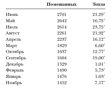 На основании целого ряда тщательных наблюдений, производившихся непрерывно в продолжение трех лет в моей клинике, я вполне убедился, что психическое состояние помешанных изменяется под влиянием колебаний температуры и давления. Так, при повышении температуры до 25°, 30° и 32°, в особенности если оно происходит сразу, число маниакальных припадков у сумасшедших увеличивалось с 29 до 50; точно так же в те дни, когда барометр показывал значительное повышение давления, число припадков быстро увеличивалось с 34 до 46. Изучение 23 602 случаев сумасшествия доказало мне, что развитие умопомешательства совпадает обыкновенно с повышением температуры весной и летом и даже идет параллельно ему, но так, что весенняя жара, вследствие контраста после зимнего холода, действует еще сильнее летней, тогда как сравнительно ровная теплота августовских дней оказывает менее губительное влияние. В следующие же затем более холодные месяцы замечается минимум новых заболеваний. Прилагаемая таблица показывает это вполне наглядно:
