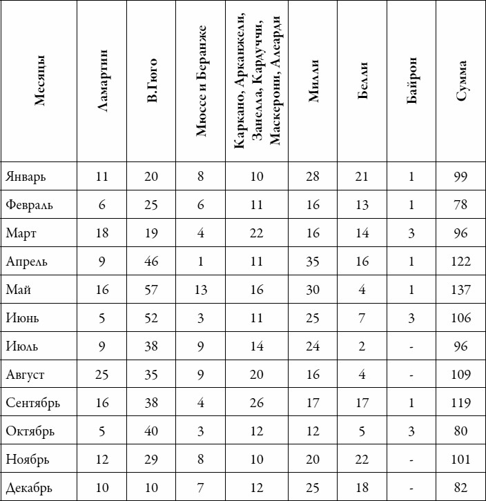 Мильтон задумал свою поэму весною. Галилей открыл кольцо Сатурна в апреле 1611 года. Лучшие вещи Фосколо были написаны в июле и августе. Стерн первую из своих проповедей написал в апреле, а в мае сочинил знаменитую проповедь о заблуждениях совести. Новейшие поэты – Ламартин, Мюссе, Гюго, Беранже, Каркано, Алеарди, Маскерони, Занелла, Арканжели, Кардуччи, Милли, Белли имели обыкновение обозначать почти на всех своих мелких и лирических стихотворениях, когда именно каждое из них было сочинено. Пользуясь этими драгоценными указаниями, мы составили следующую таблицу.