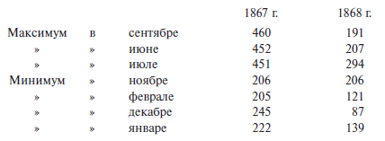 С октября до января наиболее часты предумышленные убийства, отцеубийства и разбои благодаря пустынности дорог и длинным ночам.