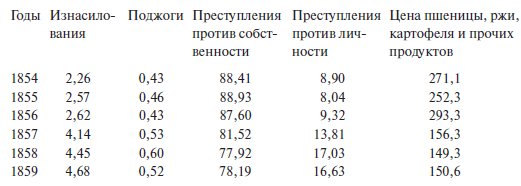 Сопоставляя, по Эттингену, преступления в Пруссии с колебаниями цен на предметы потребления первой необходимости, мы приходим к заключению, что на ежегодное число первых влияет (столько, сколько и цивилизация, если не больше) питание населения. Зависимость между последним и преступностью выражается в том, что по мере падения цен на хлеб уменьшаются преступления против собственности (кроме поджогов) и, напротив, увеличиваются преступления против личности, особенно же изнасилования, как это видно из следующих цифр: