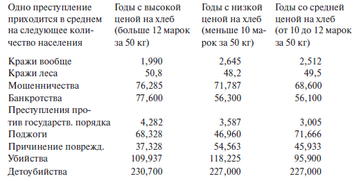 В Пруссии в 1862 году, когда цена на картофель была очень велика, преступления против собственности составляли 44,38, а против личности – 15,8 от общего числа всех преступлений. Когда же цена упала, то соответственно этому преступления первого рода уменьшились до 41, а второго – возросли до 18.