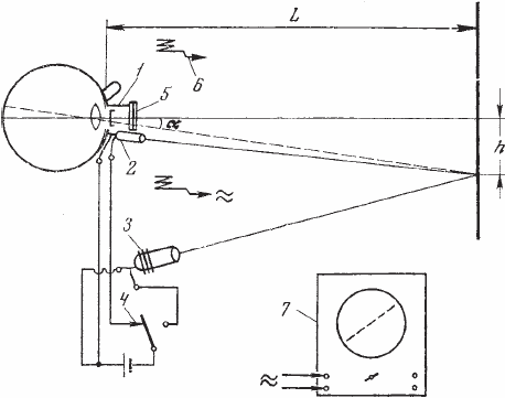1 – присоска; 2 – глазной осветитель; 3 – внешний осветитель; 4 —переключатель осветителей; 5 – датчик; 6 – приемные антенны; 7 – регистрирующий осциллограф; a – угол рассогласования