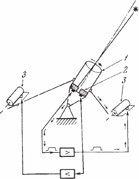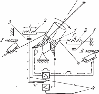 Система состоит из оптического устройства (7), светочувствительных датчиков (2) и поворотных двигателей-моторов (3). Датчики-фотоэлементы расположены так, что каждый из них закрывает одну половину «поля зрения» и может приводить в движение только один двигатель, отклоняющий оптическую систему в определенном направлении. Такая следящая система работает следующим образом. Если свет от внешнего источника попадает, например, на левый датчик, в цепи возникает электрический ток, приводящий в движение правый мотор. Если свет падает на правый датчик, в движение приходит левый мотор. Моторы включены в схему таким образом, что при засветке одного из фотоэлементов оптическая система будет поворачиваться в сторону источника света до тех пор, пока свет не упадет на другой фотоэлемент; тогда в действие придет другой мотор, т. е. возникнет сила, противодействующая действию первого мотора, и оптическая система остановится.