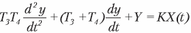 Этот вид дифференциального уравнения удобен тем, что величины Т3 и Т4 выступают явственно в его решении, хотя на графике переходного процесса они не очевидны. Математическое выражение переходного процесса такой системы можно записать так: