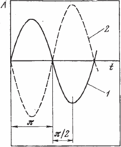 Рис. 1.12. Схема фазового запаздывания сигнала в системе с обратной связью 1 – сигнал обратной связи; 2 – входной сигнал