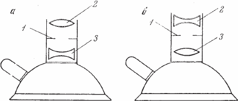 a – с отрицательной коррекцией; b – с положительной коррекцией; 1 – корректирующая диафрагма; 2, 3 – оптическая система