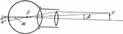 α – угол проекции a' на сетчатку; β – угол, необходимый для совмещения fovea с точкой a"