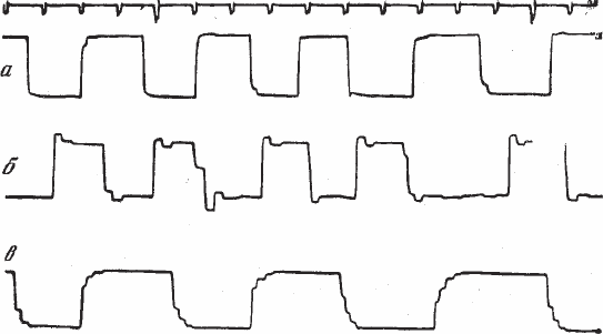 Нами была предпринята попытка экспериментально проверить, существует ли регулирование по производной. В экспериментах наблюдателю преддагалось следить за точкой, перемещающейся по определенному закону из центра экрана на некоторый угол. Скорость движения точки была подобрана так, чтобы это движение осуществлялось за время, меньшее латентного периода зрительной системы: к началу движения глаза точка останавливалась и занимала заданное положение. В этих условиях можно было ожидать три возможных типа переходной характеристики работы зрительной системы (в зависимости от ее функциональной схемы). В том случае, если система работает по жесткой программе, когда заранее задаются характеристики движения глаза (скорость, амплитуда), система не смогла бы выйти в нужное положение без дополнительной коррекции, поскольку положение стимула изменялось вплоть до начала скачка, а значит, и информация о конечном его положении во время латентного периода не могла бы быть обработана. Для случая регулирования только по положению характеристика переходного процесса должна была бы соответствовать входному сигналу, а процесс регулирования по времени не отличался бы от времени действия входного сигнала (порядка 250 мсек). Как показали эксперименты, скорость начальной фазы поворота глаза значительно больше скорости движения стимула и приближается к скорости скачка: во второй половине движения он, наоборот, оказывается замедленным. Общее время движения глаза в 2–2,5 раза меньше, чем время предъявления стимула.