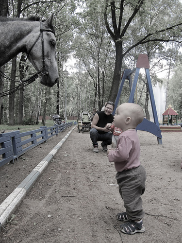 Мармеладка гладила жеребёнка и от восторга забыла про осторожность.
