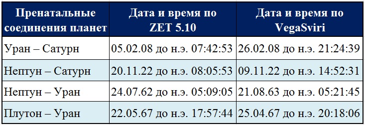 Получается, что из десяти карт пренатальных соединений четыре не соответствуют друг другу по дате и времени наступления, в том числе одна (Плутон – Уран) «разносится» программами на разные месяцы одного года (апрель и май 67 года до н.э.), а одна (Нептун – Уран) – даже на разные годы (62 и 63 годы до н.э.).