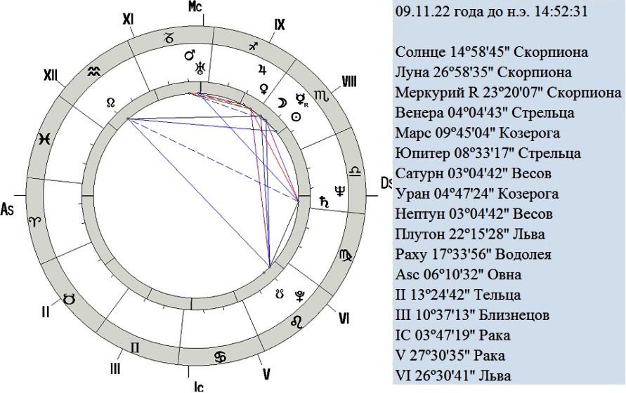 А теперь рассмотрите карту этого же соединения по VegaSviri Standard, которое согласно программе произошло одиннадцатью днями ранее, 09 ноября 22 года до н.э., и вечером, ближе к закату, в 14:52:31.