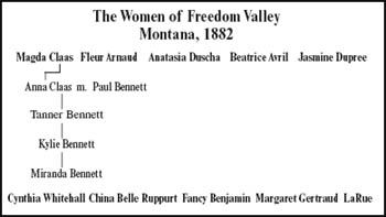 We named our valley Freedom, and our town, too. There were ten of us at first, that hot, dry summer of 1881. We found ourselves by chance, gathered in a small beautiful valley, sharing what we had to survive. Beautiful, snowcapped mountains soared along one side of the valley and there was a lovely lake and lush wild grass for our stock. We came from all parts of the world, women with children, women who had lost families and who had seen the darker side of life. Fleur Arnaud, unmarried, had lost a child by a man who took her against her will. Anatasia Duscha’s husband and son died in the wars. Beatrice Avril was a bondwoman, preyed upon by men for her pretty looks and dainty ways. Jasmine Dupree, full with child, had come from the poor South. Cynthia Whitehall came from Boston for freedom her family would not give. China Belle Ruppurt had run from buffalo hunters who had used her poorly. Fancy Benjamin’s father sold her to a farmer for a sack of oats, and widowed Margaret Gertraud’s breads and rolls didn’t save her or her children from thieves who took everything and left them starving. We know little about the woman called LaRue, except that she had loved and lost.