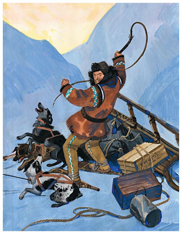День подходил к концу. Река описала огромный изгиб, и Мэйсон направил свою упряжку напрямик, через узкий перешеек. Но собаки всё никак не могли взобраться по крутому склону на берег. Они снова и снова сползали вниз, хотя Руфь и Мэйлмют Кид налегали на нарты, подталкивая их вверх. Наконец они предприняли решающую попытку. Несчастные создания, ослабевшие от голода, вложили в нее все последние силы. Вверх – еще выше – вот нарты уже почти на крутом берегу: но вдруг вожак забрал вправо, потянув за собой остальных, впряженных следом за ним, и зацепил упряжью лыжи Мэйсона. Результат оказался плачевным. Мэйсона сбили с ног; одна из собак тоже упала, нарты опрокинулись и снова скатились вниз вместе с поклажей.
