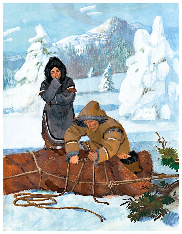 Руфь наблюдала, как Кид, используя ближайшие сосенки, ловко сооружает схрон, какие охотники используют иногда, чтобы до мяса не добрались росомахи и псы. Он пригнул верхушку сначала одной небольшой сосны, потом другой почти к самой земле и связал их ремнями из лосиной кожи. Затем кнутом заставил собак подчиниться, запряг их в двое нарт, куда сложил весь скарб, кроме шкур, в которые был укутан Мэйсон. Этими шкурами он плотно обернул товарища и крепко обмотал сверху веревками, а получившийся кокон с обоих концов привязал к согнутым соснам. Теперь достаточно одного удара охотничьего ножа – и тело взмоет высоко в воздух.
