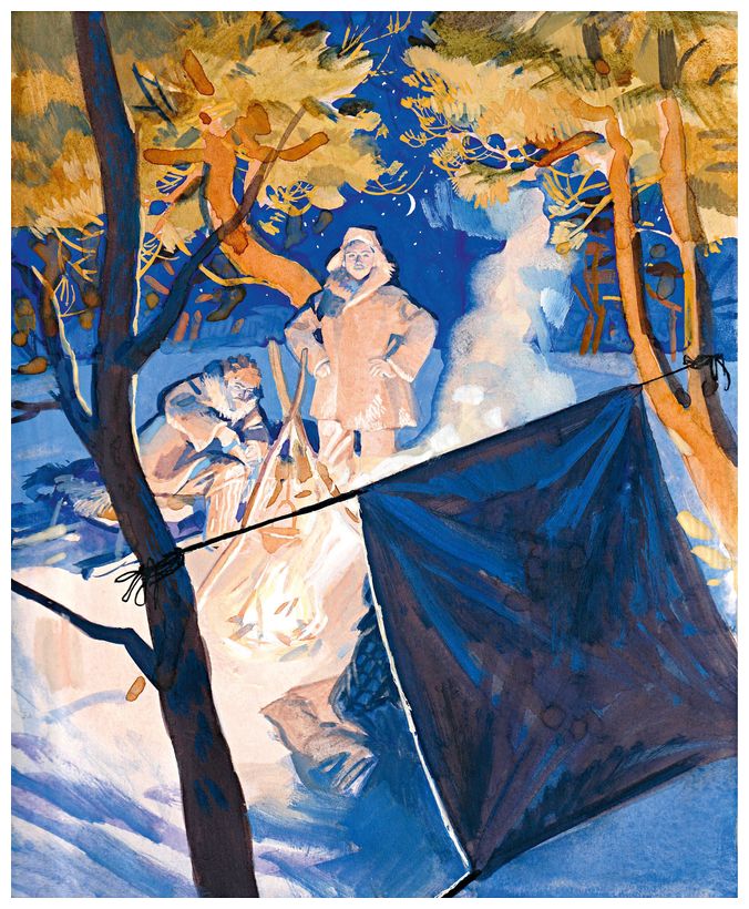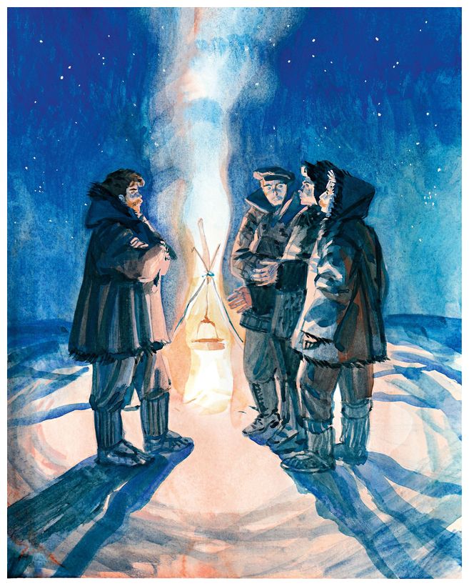 Его товарищи с улыбкой перемигнулись и замолчали. Хотя было уже около семи, до рассвета оставалось еще не меньше трех часов. Северное сияние погасло, и в ночной темноте лагерь представлял собой островок света; фигуры трех людей отчетливо вырисовывались на фоне костра.