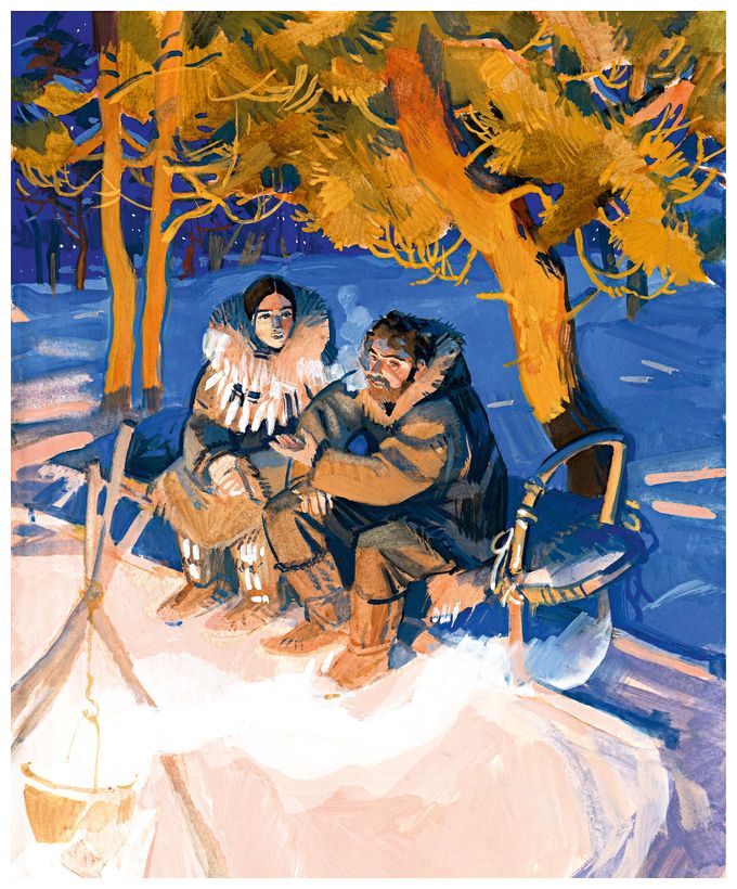 – Как только выберешь подходящую минуту, – прошептал он, – уходи из поселка, иди в направлении ветра прямо к тому месту, где ручей делает поворот. Там, у сосен, будут мои собаки и нарты, готовые для дороги. Сегодня ночью мы отправимся в путь – к Юкону. Мы должны будем ехать очень быстро, поэтому хватай первых попавшихся собак и тащи их к ручью.