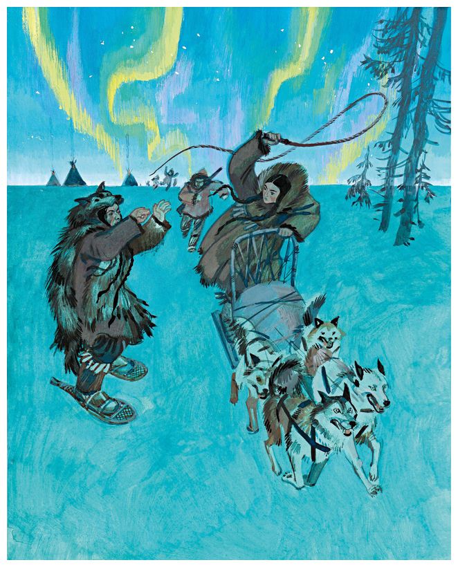 Собаки зарычали и сбились в кучу. Зигмунд прервал свою речь и прислушался: из темноты доносилось поскрипывание множества лыж. В освещенном круге у костра показалось несколько одетых в шкуры индейцев – высокие, решительные, безмолвные. Их тени зловеще плясали на снегу. Один из них, шаман, обращаясь к Сипсу, проговорил что-то гортанным голосом. Его лицо было грубо размалевано, на плечи накинута волчья шкура, открытая пасть скалила зубы над его лбом. Остальные хранили молчание. Молчали и золотоискатели. Сипсу поднялась и надела лыжи.