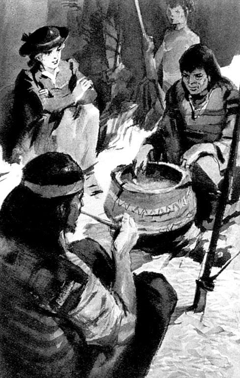 Тропа спускалась к реке по крутому обрыву. Стройная сосна, переброшенная через ревущий поток, почти касалась воды. Волны ударялись о ее гибкий ствол и приводили его в ритмическое вращательное движение, а ноги многочисленных носильщиков, прошедших здесь, отполировали ее отмытую водой поверхность. Фроне предстоял рискованный переход в восемьдесят футов. Она ступила на ствол и почувствовала, как он закачался. Услышав рев волн и увидев бешеный поток, она испугалась и отступила. Развязав шнурки своих ботинок, она сделала вид, будто затягивает их туже. Как раз в это время из лесу показалась группа индейцев. Впереди шли три или четыре парня, за ними следовало много женщин. Все они несли на голове огромные тюки. Позади них тащились дети, тоже нагруженные кладью, и замыкали шествие полдюжины собак, которые с высунутыми языками волокли свою поклажу.