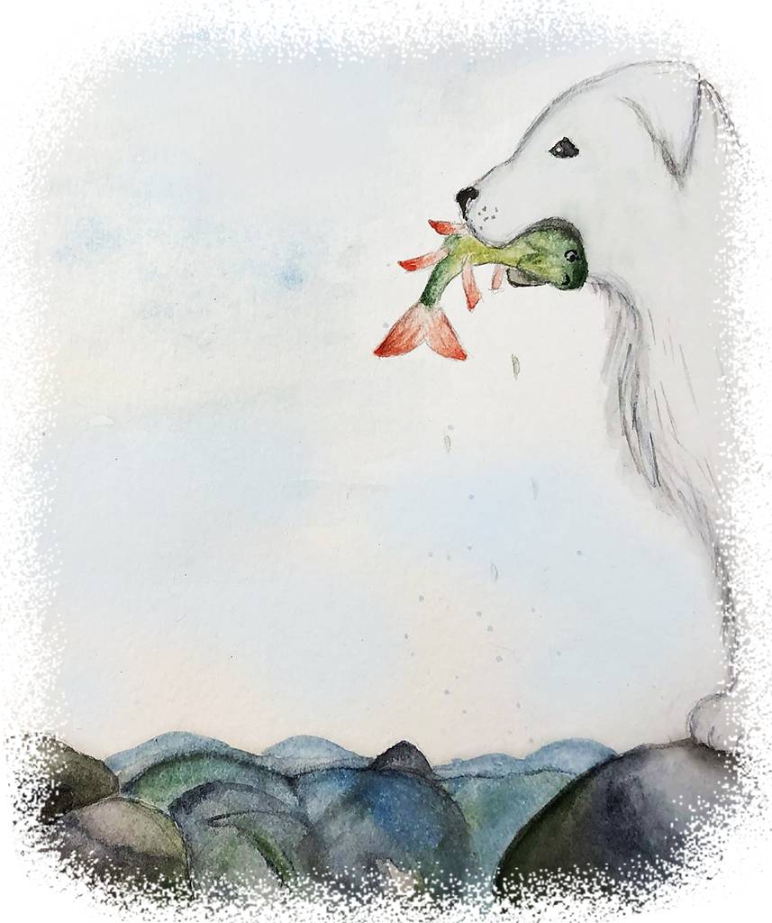 Поднявшись на водопад, чтоб оглядеться лучше, Май увидел, что благодаря каменистой запруде, образующей водопад, там собирается так много рыбы, что можно не ловить её, а просто брать голыми руками. Увидев это, Луч опустил голову в воду и вынырнул с рыбой в пасти.