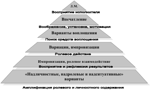Какие из этих элементов могут быть базовыми, какие производными определить сложно. Складывается впечатление, что все они выступают и как базовые, и как производные. В процессе создания и исполнения роли меняется их качество. Возможно, что именно в данной динамике и зарождается конфликт как столкновение ожидаемого (предполагаемого) и результативного (оцениваемого результата).