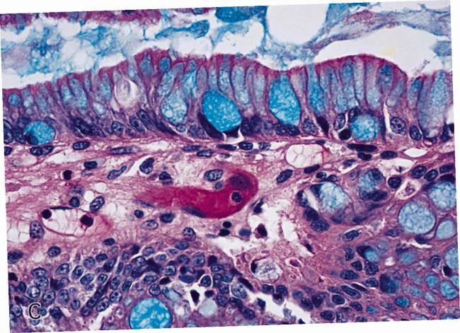 Пищевод Барретта – специальное окрашивание, выделение синим цветом типичных для поражения кишечника заполненных слизью бокаловидных клеток.