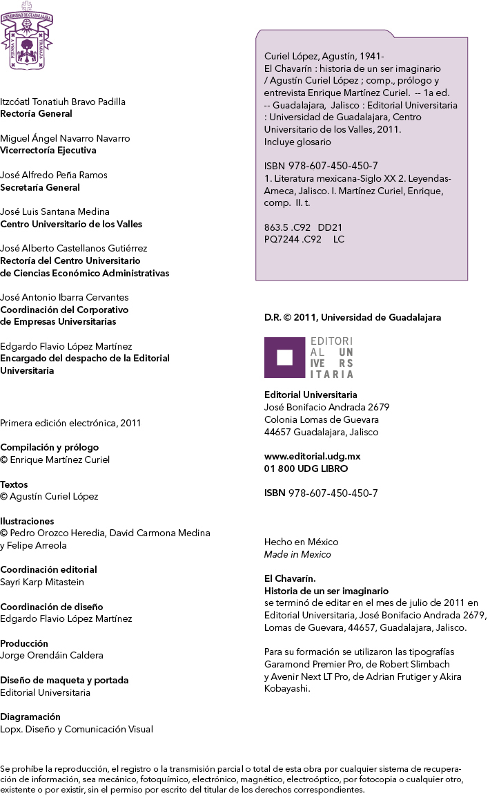 Por supuesto que México, y el estado de Jalisco en particular, no son la excepción: nuestro rico mestizaje da cuenta, además, de la influencia tanto de elementos de la religión católica como de los mitos indoamericanos, europeos y africanos, poblando nuestro campo y nuestras ciudades de creencias, de relatos fantásticos que de cuando en cuando se nutren asimismo de versiones escritas —como aquellas relativas a la aparición de imágenes religiosas o las colecciones que reúnen leyendas de determinados lugares—; tal es el caso de El Chavarín. Historia de un ser imaginario, escrita a manera de novela corta por Agustín Curiel López, a partir de la leyenda conocida en Ameca, que el autor pone en perspectiva y le da un contexto que de suyo el relato oral no tiene, pues suele ser fragmentario y estar acotado a la situación determinada en la que es contado en voz alta.