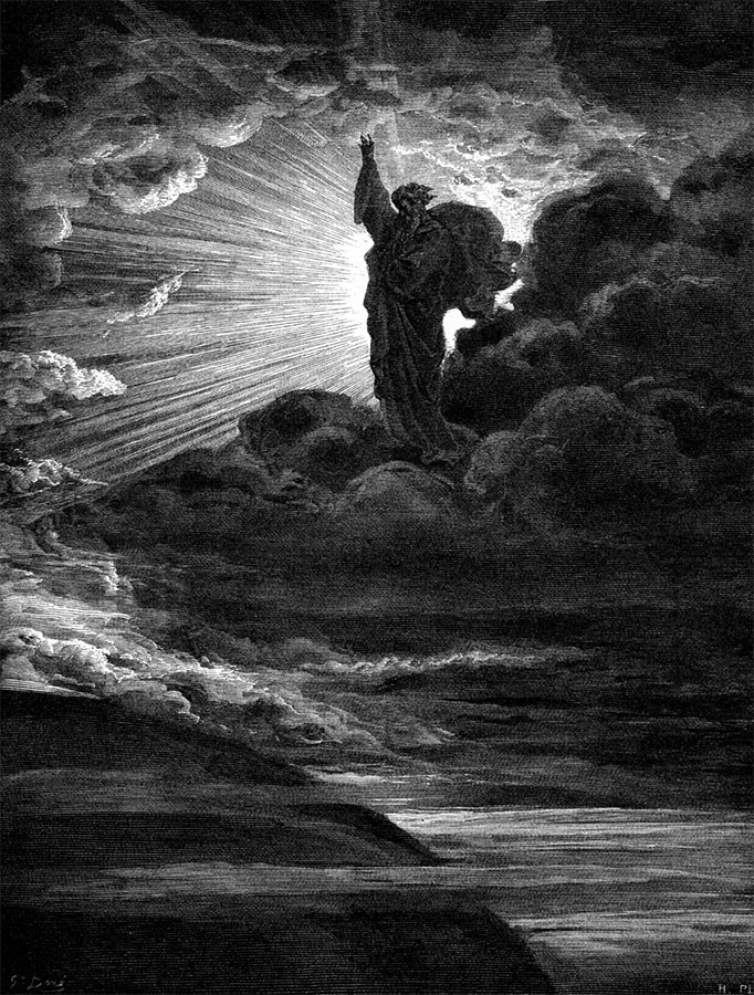 Когда настало время для начала творческой деятельности, над темным бесформенным веществом прогремело слово Божие: «да будет свет! и стал свет». Над бездной хаоса мгновенно расцвел прекрасный день Божий и озарил мрачную утробу довременной тьмы. «И увидел Бог свет, что он хорош»; и «отделил Бог свет от тьмы. И назвал Бог свет днем, а тьму ночью. И был вечер, и было утро; день один».