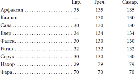 Из этой таблицы видно, что в показаниях лет послепотопных патриархов греческий и самаританский тексты сходятся между собой, а еврейский уклоняется от них, последовательно умаляя цифру на сто лет и в показании лет Нахора на 50 лет. Такое отступление явно указывает на преднамеренное сокращение лет, и даже целых поколений, так как в еврейском тексте совершенно не значится Каинан. Ввиду полного согласия греческого и самаританского текстов показание их получает больше достоверности сравнительно с еврейским.