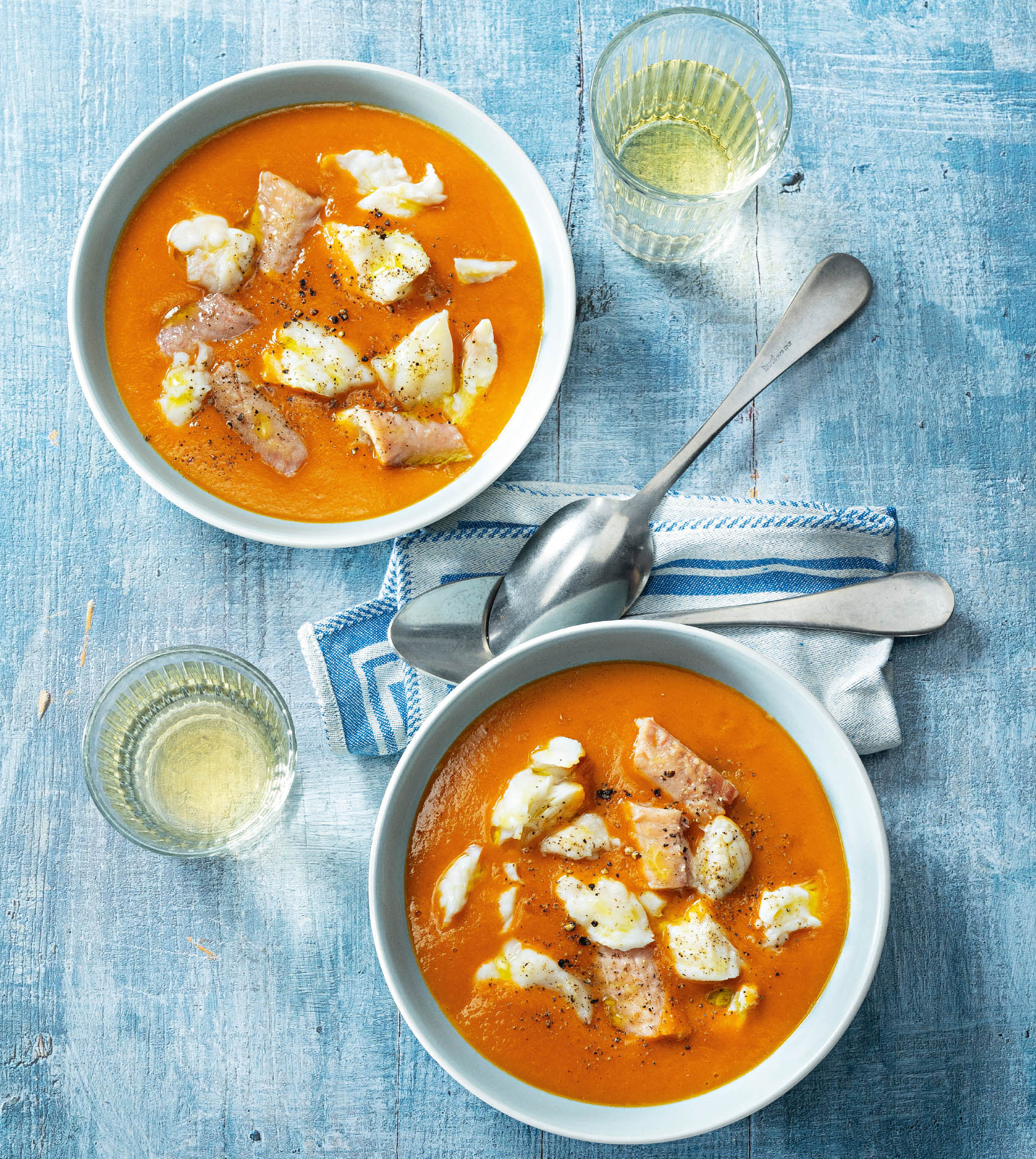 Den beiseitegestellten Seeteufel und Meeraal in Stücke zupfen. Die Suppe in Tellern anrichten, je Teller 50 g Fischstücke zufügen und servieren.