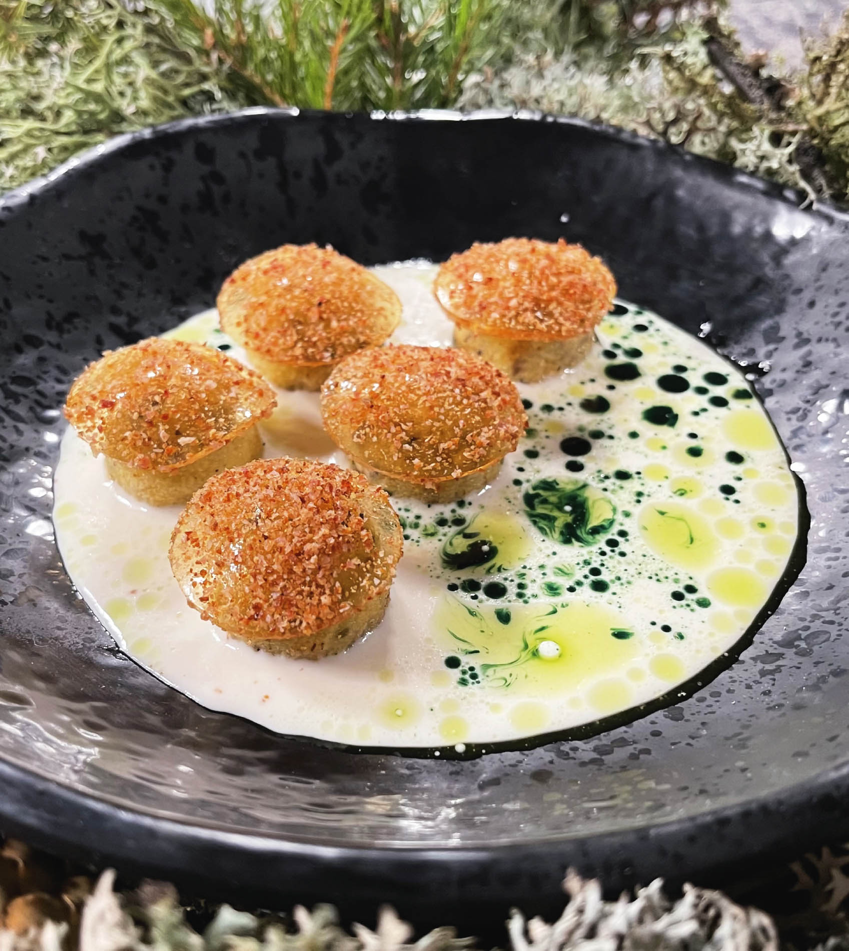 Geräucherte Kopfsalat-Suppe, Tiroler Alpengarnele und Molkeschwein