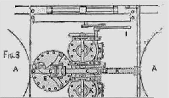 Этот рисунок взят из вышеприведённого художественного цикла иллюстрированных лондонских новостей. Несмотря на плохое качество он достаточно информативен. Два запасающих резервуара А, по-видимому, постоянно соединены друг с другом через трубу OCK. Ресивер находится на E, а редукционный клапан на G. Два цилиндра двигателя находятся на K.