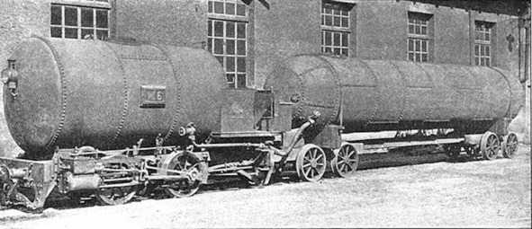 хранения сжатого воздуха, установленным на двух двухосных тележках. 1875 г. Фото с сайта «The Self Site: Unusual Steam Locomotives».