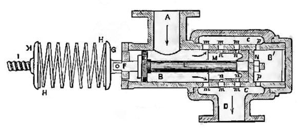 Первоначально воздух подавался прямо в цилиндры с ограничением степени наполнения путём изменения отсечки. Это оказалось неудовлетворительным, и М. Рибур, инженер, работавший на строительстве Сен-Готардского тоннеля, изобрёл этот клапан для снижения давления. Воздух из основного бака входит в патрубок A. Когда давление, действующее на поршень N при выходе из патрубка D, превышает силу, установленную при закручивании пружины вниз, клапан M перемещается влево, закрывая отверстия m и уменьшая воздушный поток. Из патрубка D воздух проходит в малый резервуар, который гасит колебания, создающиеся выталкиваемым из цилиндров воздухом. По-видимому, имелся также своего рода дроссельный клапан между малым резервуаром и цилиндрами; это до сих пор не подтверждено, но есть нечто, похожее на рукоятку регулятора, находящееся в задней части бака. Редукционный клапан Рибура был важным шагом вперёд, но подобные устройства, скорее всего, применялись ранее Андро и дю Мотай, бароном фон Ратленом и Артуром Парси, если не другими. Источник: журнал «Popular Science Monthly», т. 10, 1877.