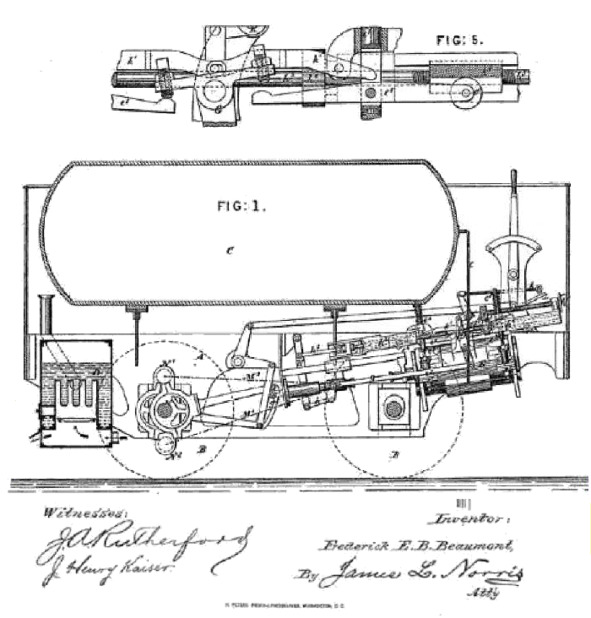 Пневмолокомотив Бомонта. 1880 г. Чертёж к патенту США №232438 от 21 сентября 1880 г. С сайта «The Self Site: Unusual Steam Locomotives».