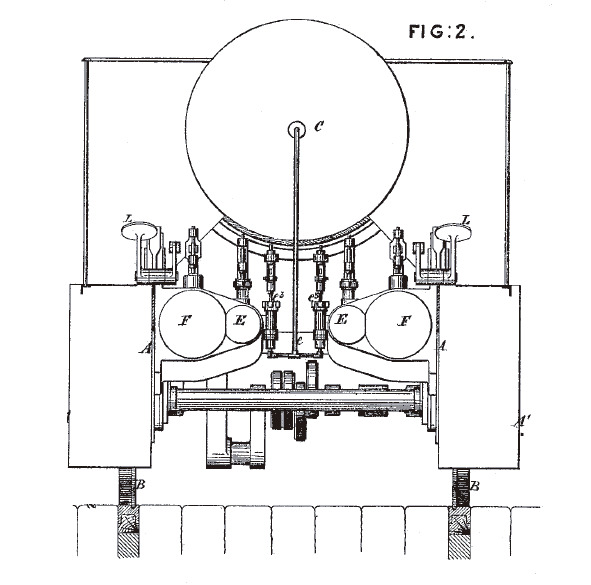 На этом чертеже показан единственный воздушный резервуар и наклонные цилиндры. Прямоугольное устройство в левом нижнем углу – это небольшой паровой котел с дымоходом, который снабжал паровые рубашки на цилиндрах, чтобы предотвратить их обледенение. Это явно нежелательное осложнение, но Бомонт счёл его необходимым. Патент определил четыре цилиндра, один высокого давления и один низкого давления на каждой стороне рамы, для работы по принципу компаунд.