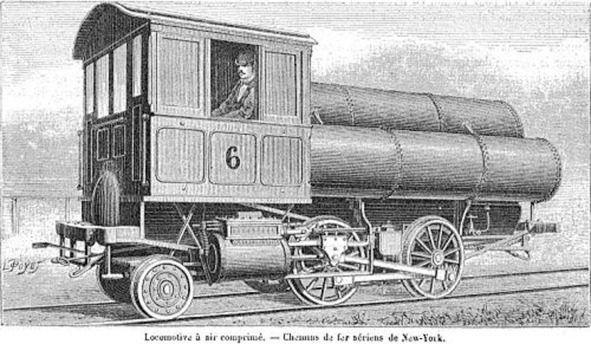Это первое широкое применение локомотивов на сжатом воздухе для перевозок. На этой иллюстрации изображён локомотив типа 0―2―0. Преимущество его использования состояло также и в том, что холодный воздух при выхлопе способствовал вентиляции тоннеля. Масса локомотива приблизительно 7 т. Источник: журнал «Popular Science Monthly», т. 10, 1877.