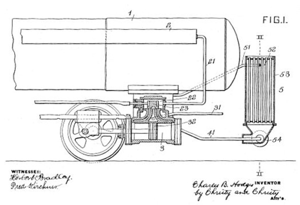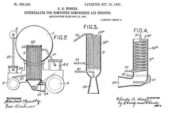 Чарльз Б. Ходжес изобрёл двигатель двукратного расширения, использующий подогреватель между цилиндрами высокого и низкого давления, чтобы подогреть частично расширенный сжатый воздух. Этот воздух пропускался через теплообменник, в котором он нагревался окружающим воздухом, всасываемым эжектором с помощью отработанного воздуха. Аналогичные эжекторы, действующие на отработанном паре, широко применялись для создания вакуума, используемого в тормозных системах паровозов. Благодаря изобретению Ходжеса отпадала необходимость в применении нагревателей, работающих за счёт сжигания некоторого количества кокса, и при этом не добавлялось никаких новых движущихся частей. Воздух был единственным используемым рабочим телом. Была достигнута существенная экономия, доходящая до 60%.