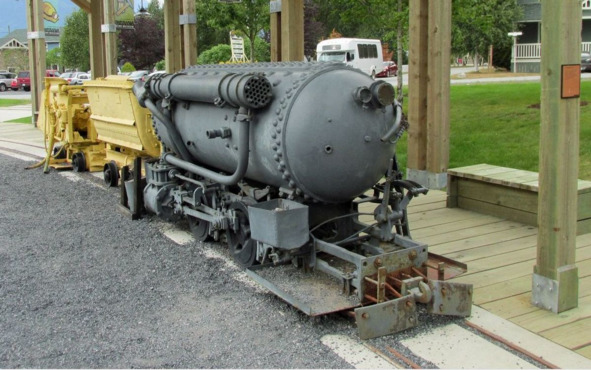 На этой фотографии хорошо видны трубопроводы. Подогреватель расположен вдоль резервуара со сжатым воздухом; окружающий воздух входит через отверстия в ближнем конце. Рожок эжектора виден в дальнем конце. Эти три трубы устроены как показано на схеме выше. В задней части резервуара два манометра, больший выполнен с клапаном отключения. Маленький рычаг управлял регулятором и большим рычагом позади работавшего тормоза. Этот локомотив первоначально использовался в угольной шахте Кэнмора в Альберте.