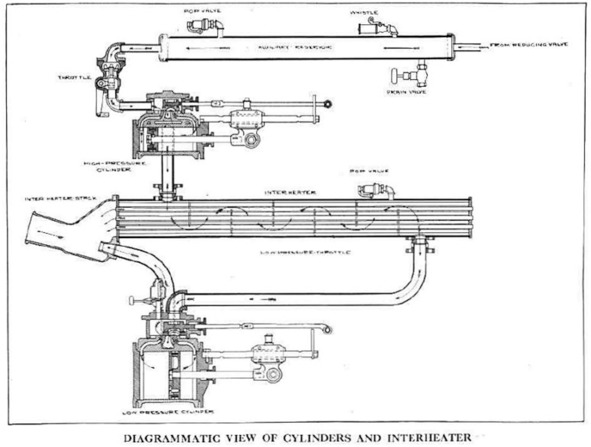 1— основной воздушный бак; 2 – вспомогательный резервуар; 3 – цилиндр высокого давления; 4 – цилиндр низкого давления; 5 – межнагреватель; 54 – эжектор. В практических проектах рожок эжектора был показан по диагонали вверх, по-видимому, чтобы не поднимать пыль с насыпи железной дороги. Патент был продан локомотивной компании Г. К. Портера. Она построила первую систему с двукратным расширением в 1908 г.