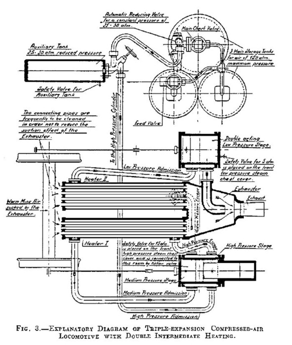 Воздух хранится при высоком давлении в основном воздушном баке и понижается до 17 ат редукционным клапаном, после чего поступает во вспомогательный резервуар, который намного меньше, чем основной бак; его цель состоит в том, чтобы сгладить колебания потока воздуха, вызванного неустойчивым впуском через клапан регулятора в цилиндр высокого давления, в котором воздух расширяется. Вспомогательный резервуар имеет форму длинной трубы, а не компактного бака, потому что при малом диаметре напряжение в металле обруча низкое, длина выбирается соответствующая. Холодный выхлоп от цилиндра высокого давления проходит через подогреватель (названный в схеме межнагревателем) и омывает трубы, через которые втягивается атмосферный воздух; отработанный в цилиндре высокого давления воздух нагревается, увеличивается его объём и повышается эффективность двигателя. Нагретый воздух поступает от подогревателя к цилиндру низкого давления, где он расширяется снова и затем проходит через струю эжектора, которая втягивает наружный воздух через подогреватель.