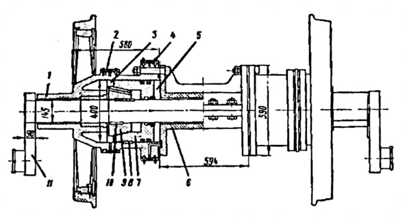 Муфта состоит из ступицы 1, отлитой вместе с колёсами, корпуса 6, соединённого с нею болтами, и чугунного поршня 7, который может скользить вдоль ступицы 1 и благодаря шпонке 8 вращаться только вместе с ней. Другими словами, части 1, 6 и 7 должны вращаться вместе с колёсами. Насадка 9 шпонкой 10 жёстко соединяется с осью 11, которая должна приводиться в движение дизелем. Направляя сжатый воздух через кольцо 4 в полость 5 и сдвигая тем самым поршень 7 влево, можно заклинить колесо с осью. Подачей воздуха через кольцо 2 в полость 3 производится расцепка их.