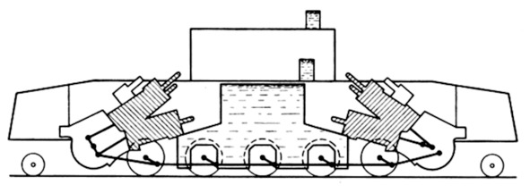 V-образные двигатели с наклонными цилиндрами установлены на брусковой раме специальной формы.