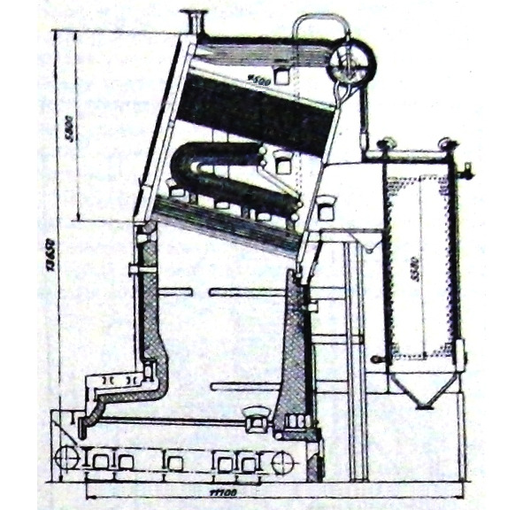 Труднее обстоял вопрос с котлом и пароперегревателем. Для высоких перегревов до 400°С перегреватель в дымовой коробке недостаточен. Это обстоятельство и далее невозможность увеличить давление пара в огнетрубных котлах выше 20 ат заставляло искать для турбовоза другие типы котлов. Из них могла идти речь только о водотрубных, ибо они позволяют поместить перегреватель вместе с высокой температурой газов и образовать достаточно большое топочное пространство для сжигания пылевидного топлива, т. е. вообще использовать низкосортное топливо. Необходимым условием постановки водотрубного котла на ограниченном пространстве локомотива является питание его совершенно чистой водой, что, в свою очередь, требует применения поверхностного конденсатора. Целый ряд вспомогательных механизмов, как дымосос, вентилятор охлаждающего воздуха, питательные насосы и пр. дают отработанный пар, который, например, Юнгстрем, использует для подогрева питательной воды до 100°С. Отходящие газы он использует для подогрева воздуха, поступающего в топку.