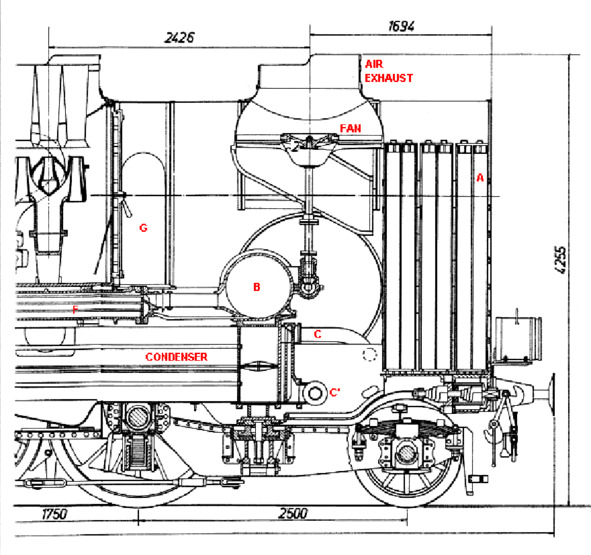 A – охлаждённая вода. Похоже, что B является вспомогательной турбиной. C и C' – трубы для охлаждающей воды конденсатора. Устройство, обозначенное буквой F над конденсатором, похоже на нагреватель питательной воды, использующий выхлоп вспомогательной турбины. G – отверстие, которое даёт доступ к дымовой коробке.